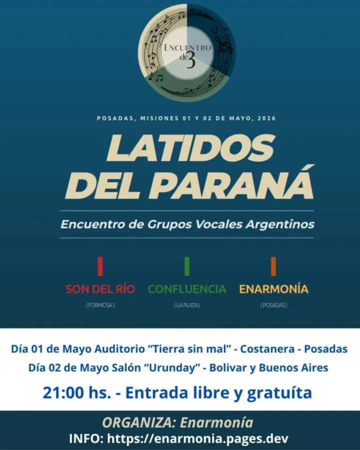 El escenario reunirá a los grupos Son del Río (Formosa), Confluencia (La Plata) y Enarmonía (Posadas), quienes ofrecerán presentaciones con arreglos vocales y propuestas musicales que invitan a recorrer diferentes climas y géneros.