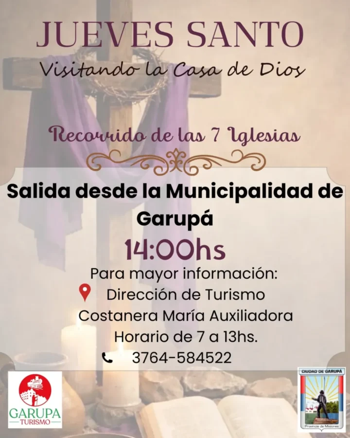 ✨En el marco de Semana Santa, Garupá invita a participar de una tradicional propuesta de fe y reflexión: el recorrido de las siete iglesias, una práctica que forma parte de las celebraciones del Jueves Santo y que convoca a vivir un momento de espiritualidad.