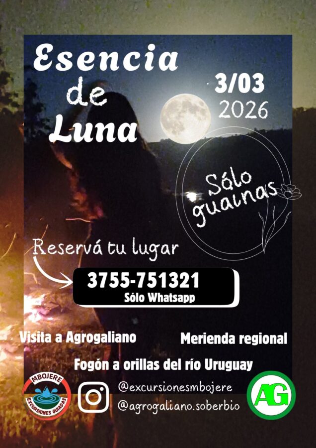 La actividad incluye visita guiada a Agrogaliano, donde se conocerá el proceso de producción de aceites esenciales de citronela, seguida de un fogón a orillas del río Uruguay para recibir la luna llena. La jornada se completa con merienda regional, degustación y sorpresas preparadas para hacer de este momento algo verdaderamente único.