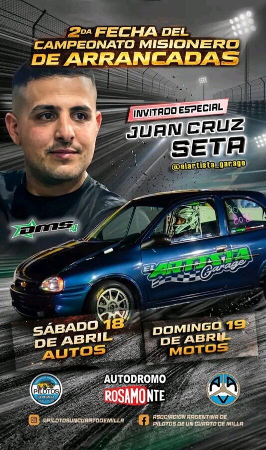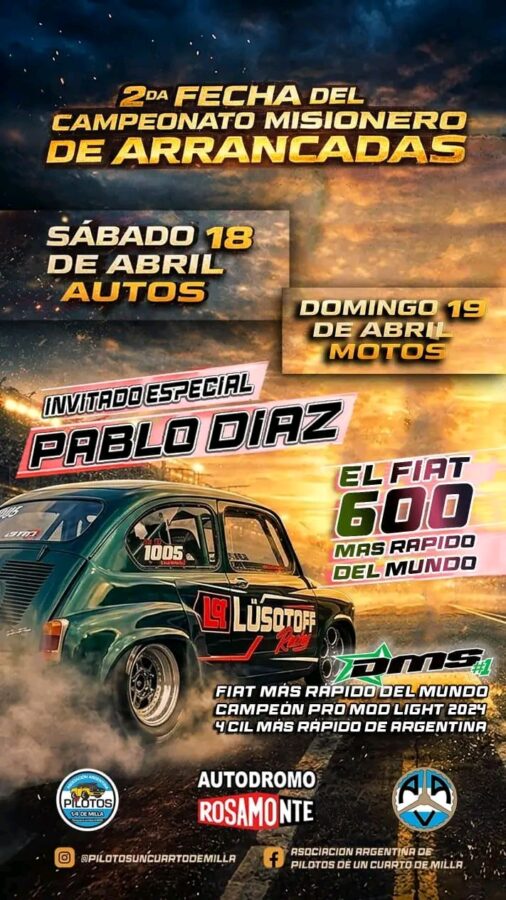 La jornada contará con destacados protagonistas del mundo motor, entre ellos el invitado especial Juan Cruz Seta y la participación de Pablo Díaz, reconocido por su impactante Fiat 500, uno de los más rápidos del mundo, que promete llevar la emoción al límite.