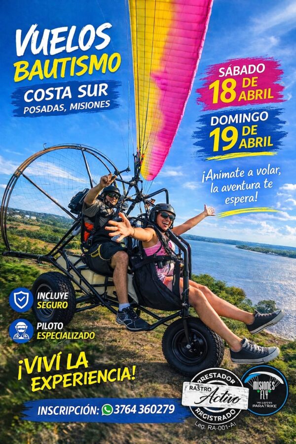 🪂 Una propuesta diferente para descubrir Posadas desde el aire y vivir una experiencia llena de emoción y paisajes únicos. La actividad permite realizar un vuelo en paratrike contemplando vistas panorámicas del río y la ciudad, en una experiencia segura y guiada para quienes quieran animarse a algo distinto.