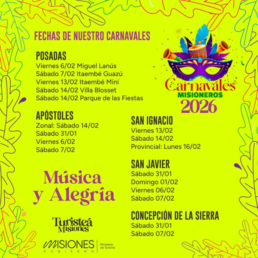 La edición 2026 comienza el 31 de enero en la localidad de Apóstoles y se extiende hasta el 16 de febrero, fecha en la que se llevará a cabo el Carnaval Provincial, instancia que reúne a comparsas de distintos puntos de Misiones en un encuentro que celebra el trabajo, la pasión y la tradición del carnaval.