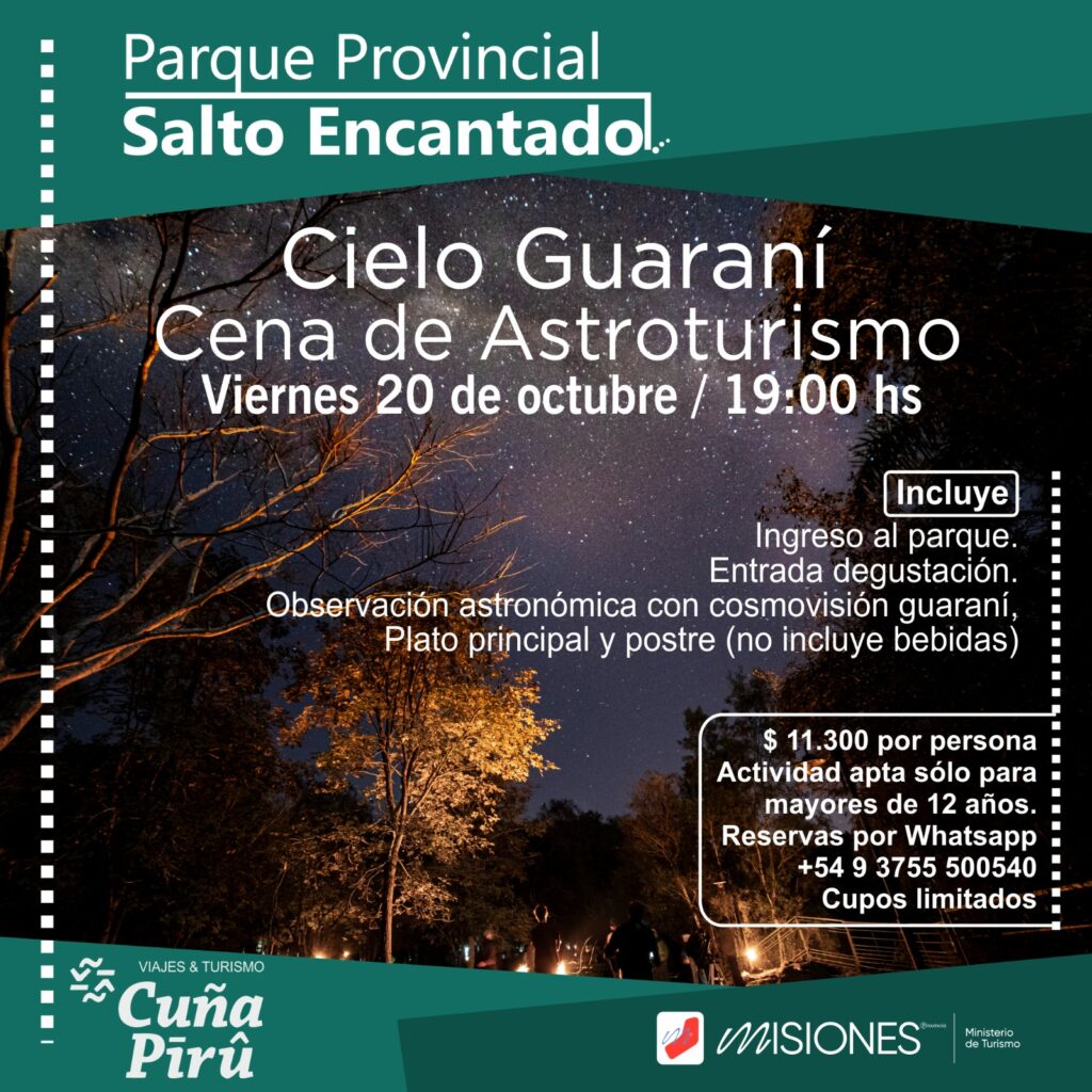 “Cielo Guaraní – Cena de Astroturismo” se llama la iniciativa que se enmarca en una modalidad asociada al turismo de naturaleza en la Ruta Natural Argentina y se reconoce como actividad lúdico científica que busca poner en valor los recursos naturales y culturales vinculados a la conservación de paisajes y patrimonios en el ámbito de la astronomía. Además, se podrá conocer cómo la Nación Mbya proyecta su mundo, contemplando el espacio profundo y observando el paisaje nocturno.